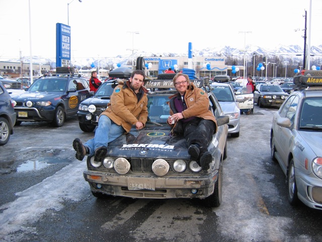 Preparing ourselves and the car took a long time, but as we pulled away from the starting line in Kirkland, Washington on February 18th we felt as ready as we could be. Our families and friends were there to give us a final boost with encouragement and cheering. The assembled Alcan teams and vehicles, made us realize that we were indeed setting out on a major adventure. We were primed and the pressure was on.